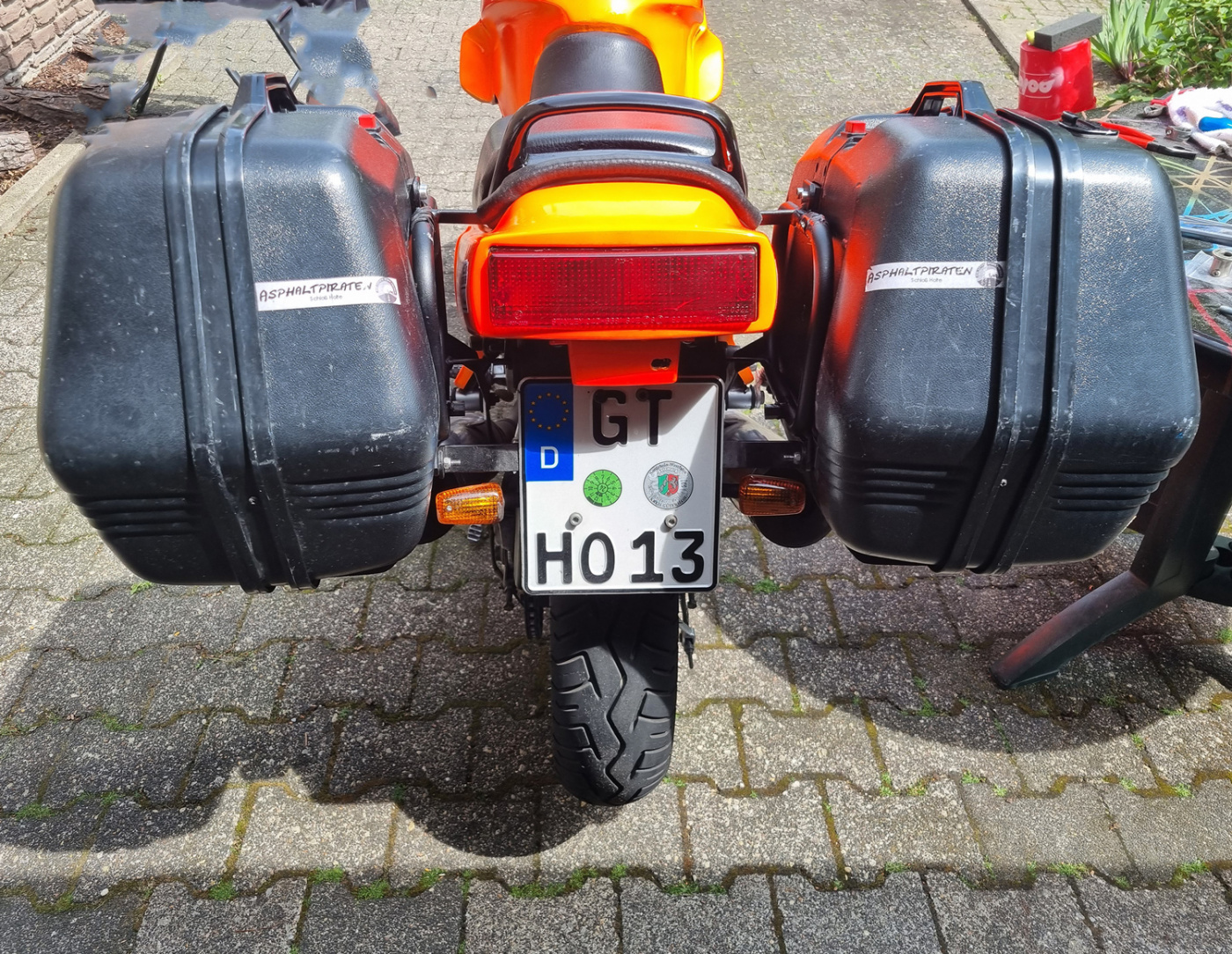 Viel zur Marke kann ich garnicht sagen. Die ersten Reisen waren ja mit Packtaschen – geht auch ist aber auf dauer recht nervig und vorallem nicht so schön dicht und praktisch. Die Koffer mit Halter habe ich gebraucht gekauft und mit ein paar Anpassungen passt auch der Halter vom D-Modell an das A-Modell.