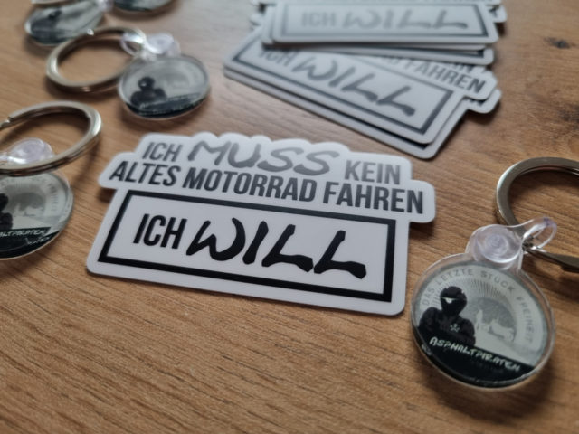 Auf der Messe „Lipper Modellbau Tage“ in Bad Salzuflen haben wir einen alten Volvo mit dem Aufkleber „Ich muss kein altes Auto fahren – ich will“ gesehen. Passt ja zu uns, wenn man „Auto“ mit „Mopped“ tauscht. Online gabs den leider nicht – darum haben wir einfach mal welche bei stickermule selbst gemacht!